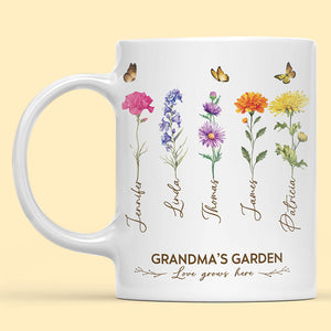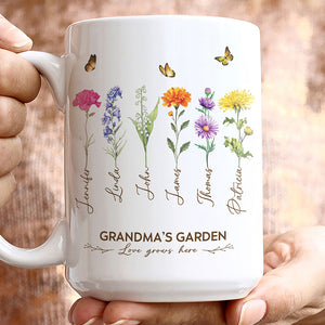 Celebrate Grandma’s love with this personalized Grandma's Garden birth month flower mug. Featuring the names and birth flowers of her cherished family, this heartfelt gift is perfect for birthdays, Grandparents’ Day, or any special occasion to remind her how much she’s loved with every sip!