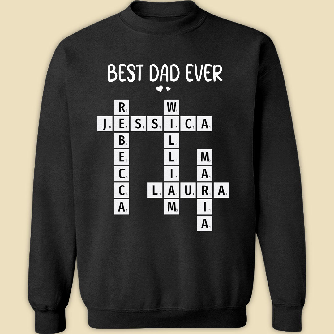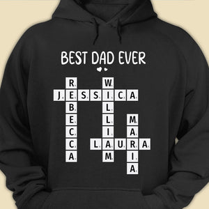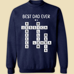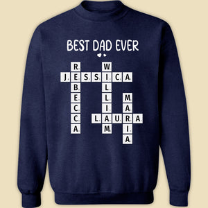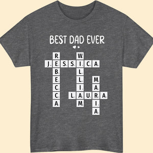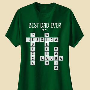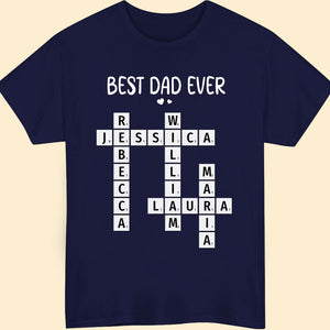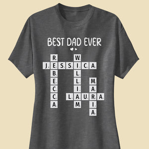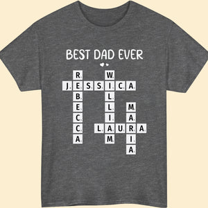Celebrate Dad with this personalized Best Dad Ever crossword shirt! Featuring the names of his loved ones, this unique and meaningful gift is perfect for Father's Day, birthdays, or any special occasion to show him how much he’s appreciated!