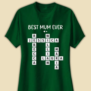 Celebrate Mum with this personalized "Best Mum Ever" crossword shirt, featuring the names of her loved ones. A unique and meaningful gift that lets her wear her title with pride. Perfect for Mother’s Day, birthdays, or any special occasion to show your love and appreciation!